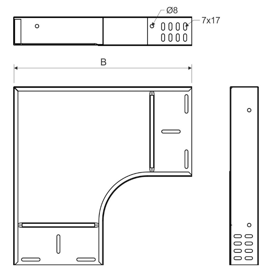Oblouk pro odbočení trasy v horizontálním směru pod úhlem 90° pro kabelový žlab rozměru 60x100 mm, povrchová úprava sendzimir, přímé spojení s kabelovým žlabem bez nutnosti použití spojky