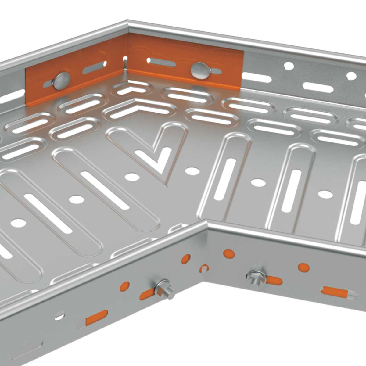 Úhlová spojka pro vytvoření oblouku kabelové trasy výšky bočnice 100 mm v horizontálním směru v úhlu 0°až cca 120°, povrchová úprava sendzimir