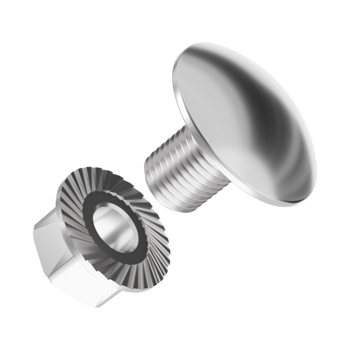 Šroub s vratovou hlavou a nízkým čtyřhranem pro spojování jednotlivých komponentů kabelových nosných systémů, součástí je též matice s integrovanou podložkou s drážkováním povrchová úprava zinkochromát