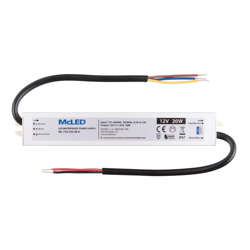 Zdroj konstantního napětí, výkon 20W, krytí IP67, výstup: 12VDC, max. 1,67A. Vstup: 100-264VAC, 50-60Hz, materiál krytu: hliník. Rozměry: 165x30x20mm, hmotnost: 205g. Zdroj SELV. Při výběru zdroje počítejte s výkonovou rezervou min. 20%.
