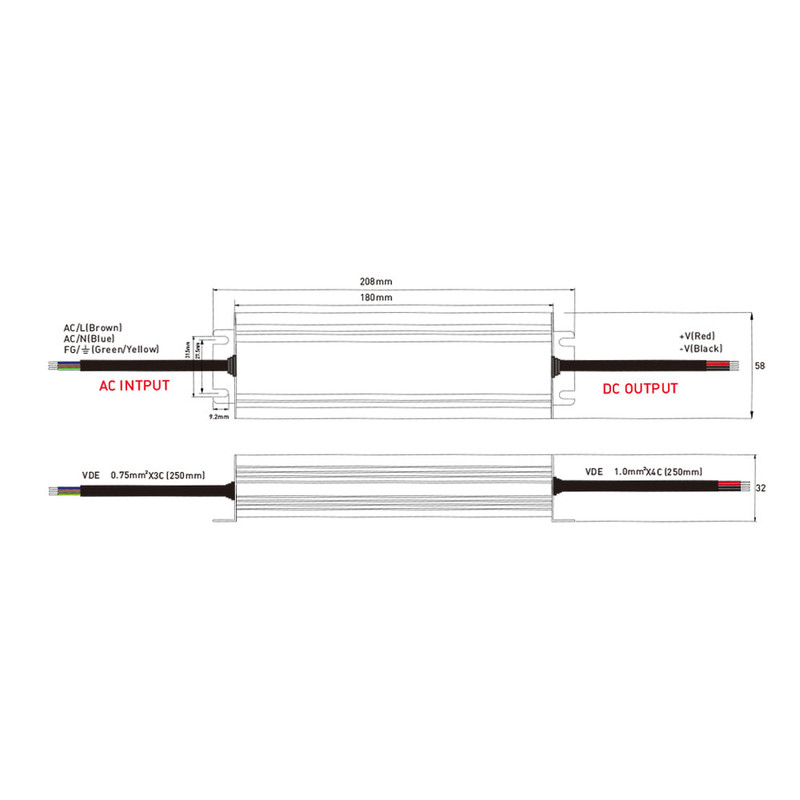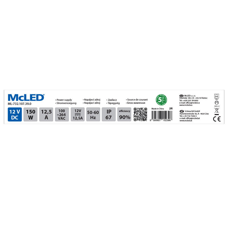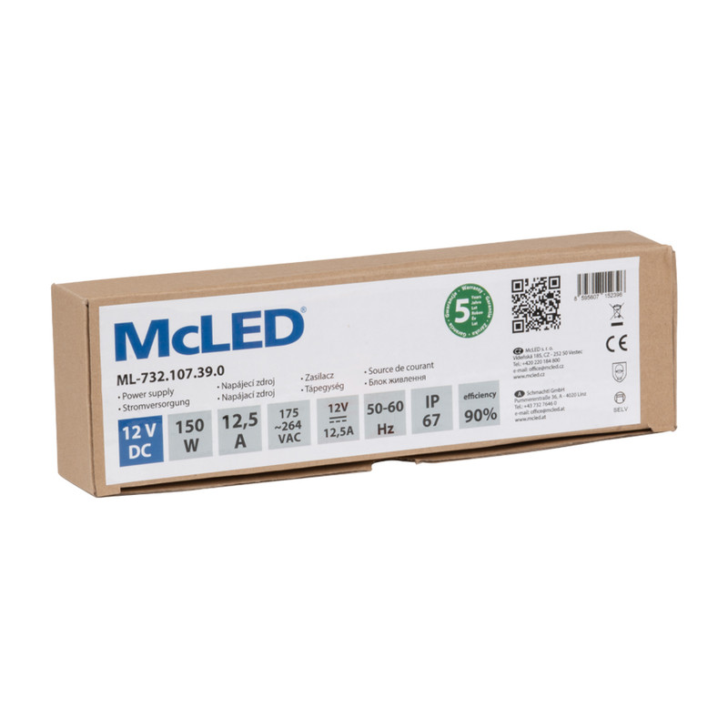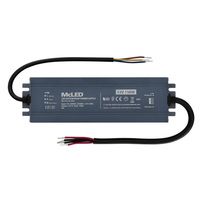 Zdroj konstantního napětí, výkon 150W, krytí IP67, výstup: 12VDC, max. 12,5A. Vstup: 175-264VAC, 50-60Hz, materiál krytu: hliník. Rozměry: 180x58x32mm, hmotnost: 690g. Zdroj SELV. Při výběru zdroje počítejte s výkonovou rezervou min. 20%.