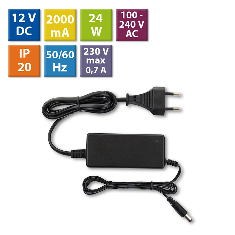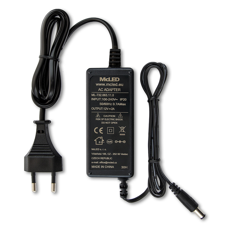 Napájecí adaptér 24W, DC12V/2A, IP20, černý plast, s vidlicí