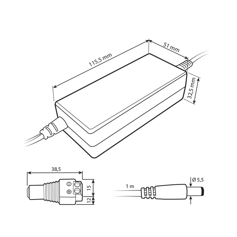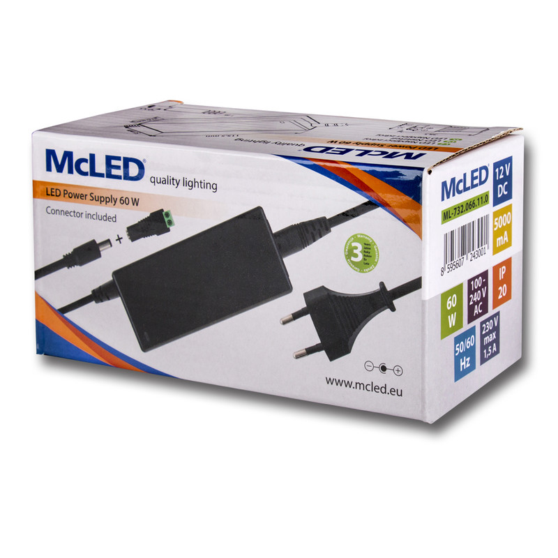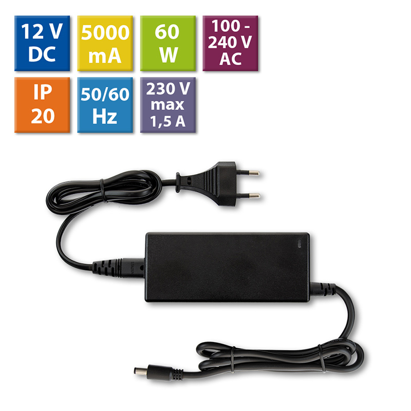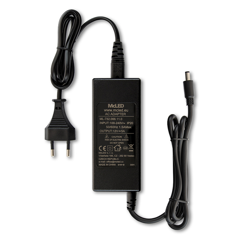 Napájecí adaptér 60W, DC12V/5A, IP20, černý plast, s vidlicí