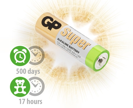 BaterieGP Super Alkaline patří k základní výbavě každédomácnosti. Nejlépeje využijete ve všech přístrojích s nízkým odběrem proudu, jakojsou budíky, TVovladače, hračky, dálkováovládání, bezdrátovémyši odpočítače nebo klávesnice.Oproti obyčejným zinkouhlíkovým nebo zinkochloridovým bateriím vás zásobíaž 7×větším množstvím energie.