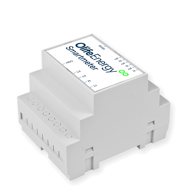 SmartMeter měří aktuální spotřebu objektu nebo jeho dílčího okruhu, vyhodnocuje dostupný příkon pro nabíjení EV a reguluje maximální nabíjecí proudovou stanici. OlifeEnergy SmartMeter řídí právě jednu nabíjecí stanici OlifeEnergy na jedné přípojce. (jeden nebo dva nabíjecí tělo podle modelu nabíjecí stanice). Jednotka se umísťuje do hlavního rozvaděče na DIN lištu. Proud je měřen nepřímo pomocí měřících transformátorů s děleným jádrem. Komunikace se stanicí probíhá po sériové lince pomocí sběrnice RS485 nebo volitelně pomocí bezdrátového modulu.