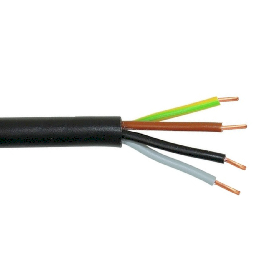 pro pevné uložení ve vnitřních a venkovních prostorách, počet žil 4, průřez vodiče 10 mm2, materiál jádra měď (Cu), barva vodičů zeleno-žlutá, hnědá, černá, šedá