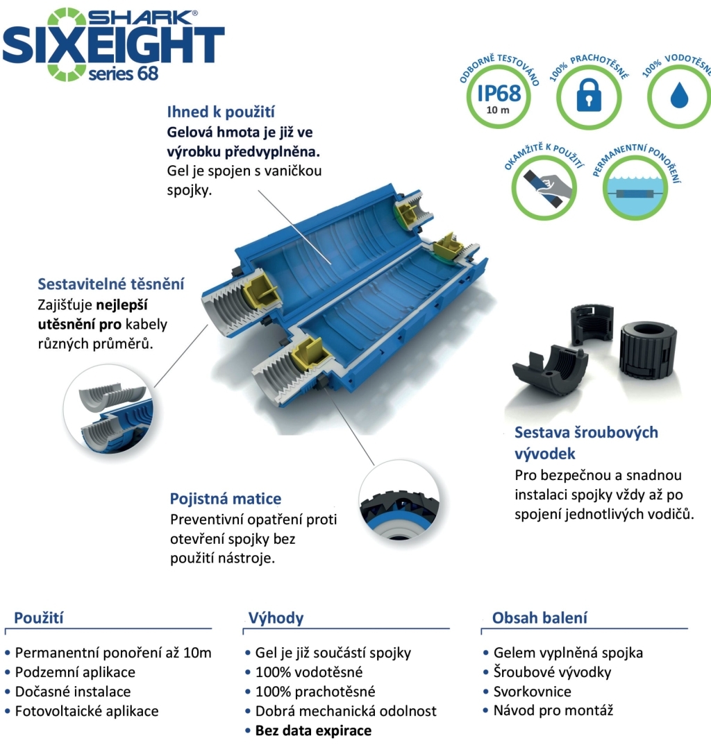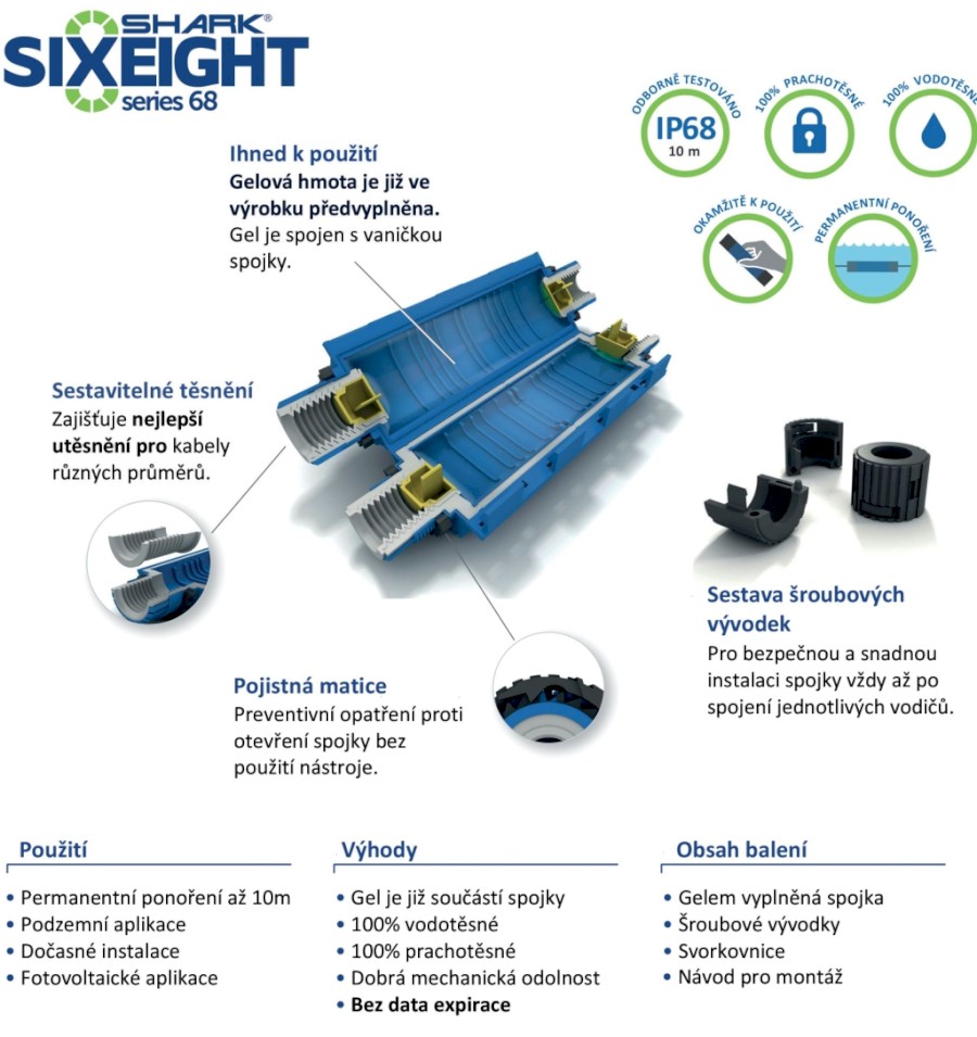 Spojky jsou určeny pro jedno i více žilové kabely s plastovou/pryžovou izolací jako např.: CYKY, 1-CYKY a další. Kabelová gelová spojka SHARK IP68 je určena pro spojení přímé např. spojení kabelu pod vodou, spojení kabelu pod zemí, spojení kabelu na vzduchu, spojení v kabelových kanálech a nebo se dá použít jako dočasná instalace. Dostupné jsou 3 rozměrové varianty pro průřezy vodičů od 2,5 mm2 až 50 mm2. Gelový systém izolace je rychlejší oproti zalévacím pryskyřicím (nemusí zrát). Není potřeba žádné speciální nářadí - vše je součástí balení. Možnost opětovného přístupu - spoj lze jednoduše demontovat. Široká teplotní použitelnost -20 °C až 90 °C a odolnost proti UV záření. Výrobek není chemicky nebezpečný a je šetrný k životnímu prostředí. Další výhodou je neomezená doba skladovatelnosti - bez data expirace (nemusíte se bát, že se cokoliv s gelovou spojkou během týdnů skladování stane - bude vždy připravena k použití). Součástí balení je samotná spojka s gelovou výplní, pojistné matice (vývodky), svorka - dle typu, montážní návod.