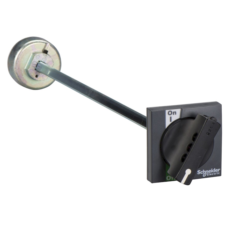 It is an extended black rotary handle for Compact INS250_100 to 250 and Compact INV100 to 250 switch disconnectors. It is suitable for isolation and it is used for standard applications. This rotary handle is a front control accessory. This extended version makes possible to operate devices installed at back of switchboards, from the switchboard front. The degrees of protection are IP55 and IK08. It may be locked in the OFF position by one to three padlocks, hasp diameter 5 to 8 mm (not supplied).