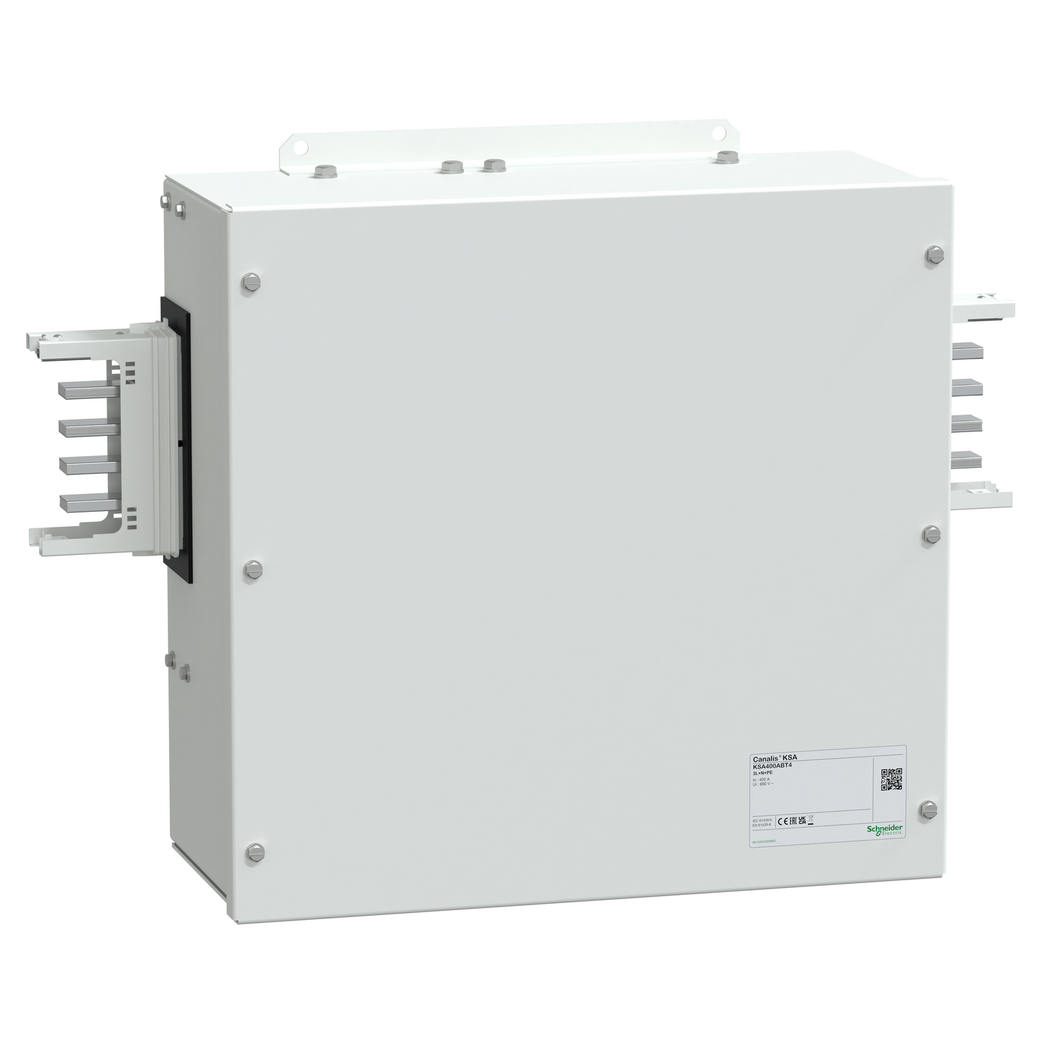 Canalis feed-unit for KSA. It is compatible with FL21 gland plate. The rated operational voltage is from 230VAC to 690VAC. The rated operational current is 400A. The bar material of feed-unit is aluminium with white RAL 9001 surface treatment. Busbar mounting by screws with central mounting location, connection by Lug terminals. Designed with 1 circuit allowing. It provides IP55 protection which conforming to IEC 60529 standard. IK08 conforms to IEC 62262. It is compliant with both IEC 60439-2 and IEC 61439-6. It is also compliant with Green Premium (RoHS/REACH).