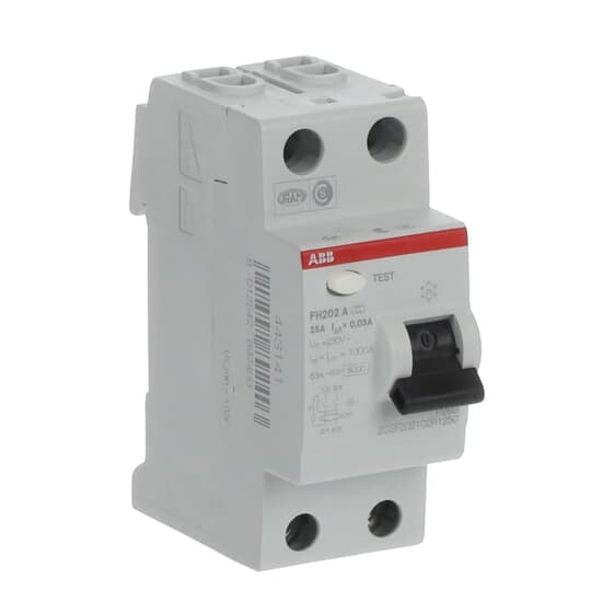 FH202 A-25/0,03; proudový chránič; dvojpólový; jmenovitý proud: 25 A; citlivost: 30 mA; Typ A – pro střídavý a pulzující stejnosměrný reziduální proud (určeno pro 1f obvody s usměrňovači)