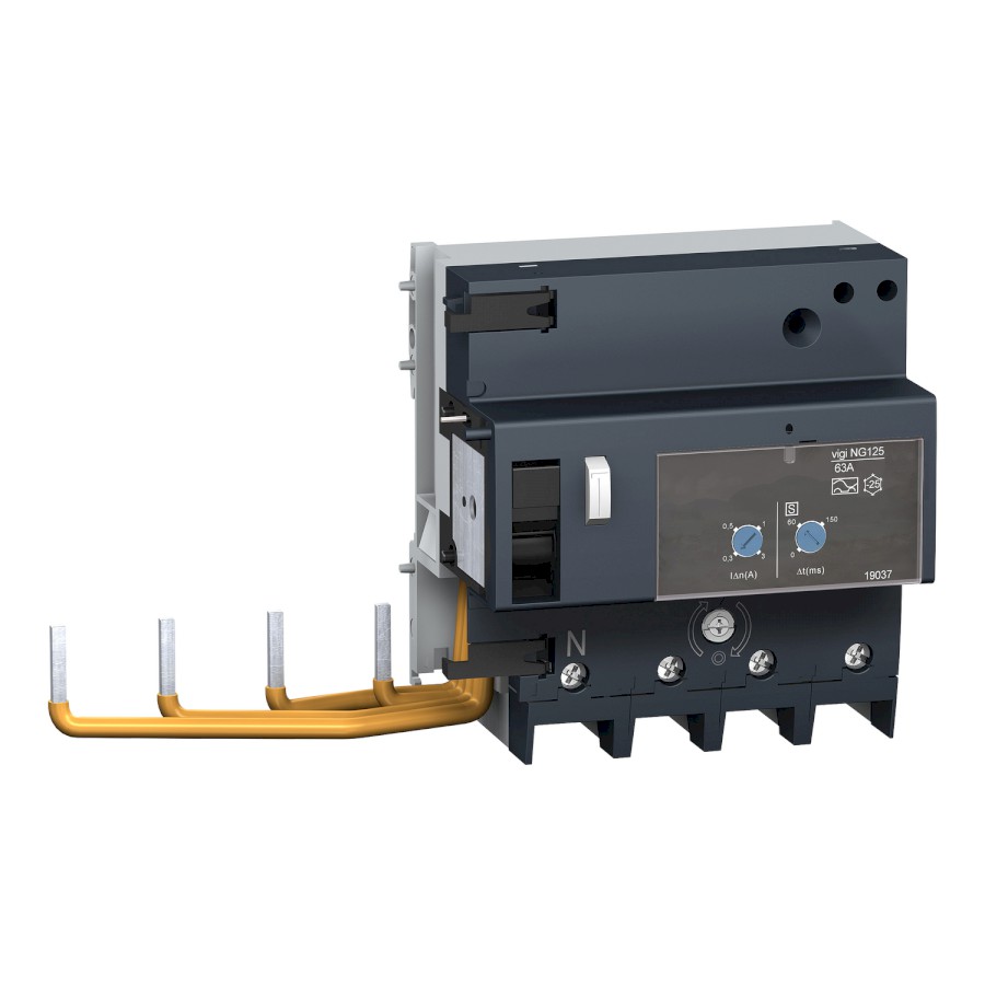 This Vigi NG125 is a modular add-on residual current devices. It has 4P and rated current is 63A. The earth leakage protection class is A type with a sensitivity of 300mA and a voltage independent technology. This product protects against short circuit, cable overload, electrical shock by indirect contact and fire hazards. This device is combined with a NG125 circuit breaker to provide the earth leakage protection and circuit protection. This product is compliant with IEC 60947-2 standard. The Ue rated operational voltage is from 230VAC to 415VAC. The Ui rated insulation voltage is 690VAC. The Uimp rated impulse withstand voltage is 8kV. The pollution degree is 3. It can be mounted on 35 mm symmetrical DIN rail. The width in 9mm pitches is 11. The dimensions are (W) 207mm. The weight is 0.45kg. The degree of protection is IP20 and IP40 in an enclosure.