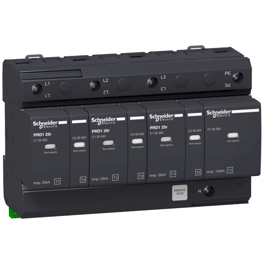 This Multi9 PRD1 product is a surge arrester with pluggable cartridge. It has 3P+N pole. The maximum continuous operating voltage is 350V (L-N or N-PE). It is available for TT or TN-S earthing system. It is a type 1 and type 2 surge arrester. It protects electrical installations against direct lightning strikes by finely clipping the lightning wave overvoltages. It is fitted with easy-to-replace withdrawable cartridges. The device has an end-of-life indication (white for correct operation, red at end of life) with remote signalling. The nominal discharge current (impulse 8-20 µs) is 25kA with a maximum of 40kA. The Uc maximum continuous operating voltage in differential mode (between phase and neutral) is 350VAC. The Uc maximum continuous operating voltage in common mode (between neutral and earth) is 350VAC. The maximum lightning current Iimp (impulse current 10-350 µs) is 25kA between L-N and 100kA between N-PE. The rated voltage network is 230VAC or 400VAC. The voltage protection level goes up to 1.5kV. The degree of protection is IK05 and IP20 on its terminals becoming IP40 once in modular enclosure. It can be mounted on DIN rail for modular installation. Its width is 16 modules of 9mm. This product complies with IEC/EN 61643-11 standard.