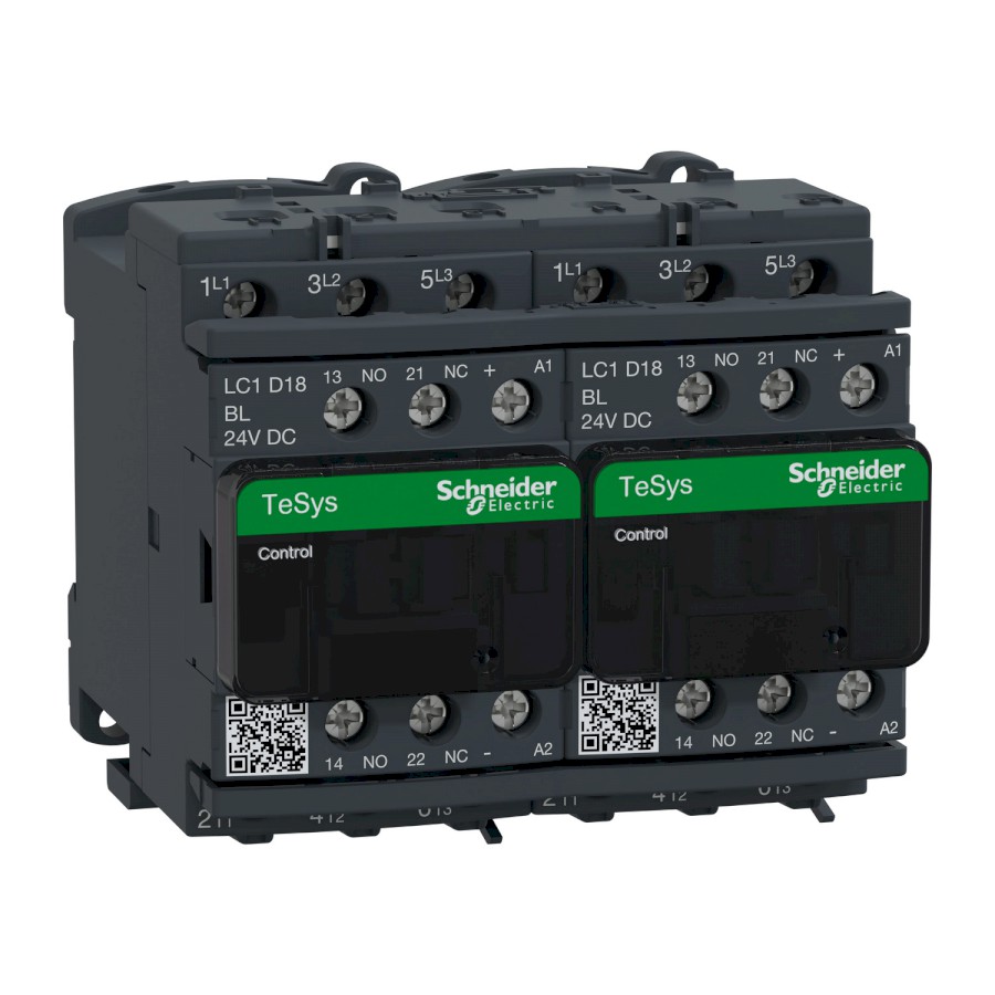 reverzační stykač 3P(3Z) 18A AC-3 440V-pomocné kontakty 1Z+1V-cívka 24V DC
