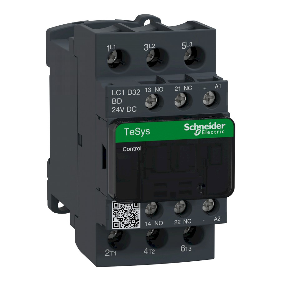 TeSys D stykač - 3P (3Z) - pro aplikace ovládání motoru do 32 A/690 V AC-3 (15kW@400V). Poskytuje cívku 24 V DC s odrušovacím modulem, 1 Z + 1 V vestavěnými pomocnými kontakty (v zrcadlové certifikaci), připojení šroubovými svorkami. Pro provozní rychlosti do 3 600 cyklů/hod. a prostředí až do 60 °C zajišťuje vysokou spolehlivost a odolnost. Kompaktní (šířka 45 mm), montáž na lištu DIN nebo upevnění šroubem. Certifikováno více standardů (IEC, UL, CSA, CCC, EAC, Marine), vyhovuje Green Premium (RoHs/Reach).