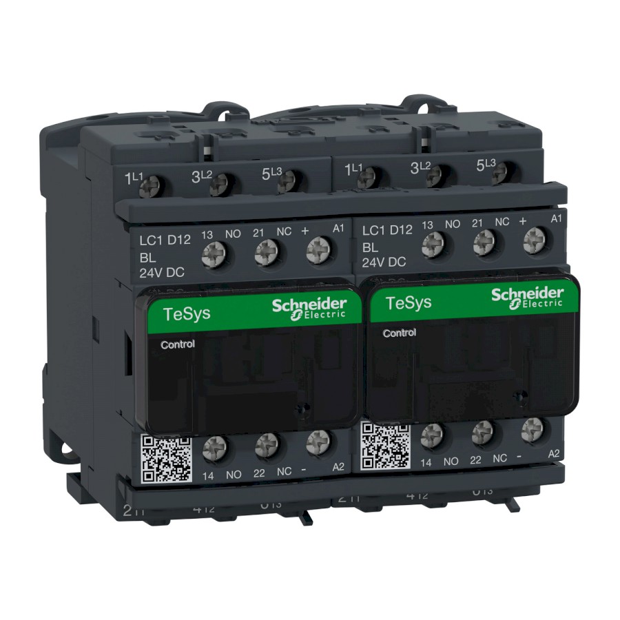 TeSys D reverzační stykač - 3P (3Z) - pro aplikace ovládání motoru do 12 A/690 V AC-3 (5.5kW@400V). Poskytuje nízkoenergetické 24V DC cívky s přechodovým odrušovacím modulem, 2Z+2V vestavěné pomocné kontakty (NC zrcadlové kontakty), připojení šroubovými svorkami. Pro provozní rychlosti do 3 600 cyklů/hod. a prostředí až do 60 °C zajišťuje vysokou spolehlivost a odolnost. Kompaktní (šířka 90 mm), montáž na lištu DIN nebo upevnění šroubem. S předzapojenými reverzačními napájecími přívody mechanické blokování (bez elektrického blokování). Certifikováno více standardů (IEC, UL, CSA, CCC, EAC, Marine), vyhovuje Green Premium (RoHs/Reach).