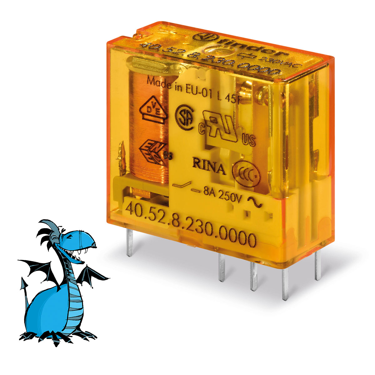 Finder Relé do patice/do plošných spojů 405282300000, 2P/8 A, cívka 230 V AC, kontakty AgNi, délka vývodů 5,3 mm do PS