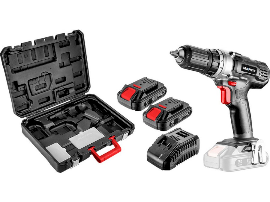 GRAPHITE Energy+ Kit. Sada obsahuje: vrtačku/šroubovák (58G006) se dvěma 2,0Ah bateriemi (58G001) a nabíječku (58G002) v kufříku. Kufřík má další přihrádky na příslušenství. Technické specifikace: Akumulátorová vrtačka/šroubovák 18 V, Li-Ion, otáčky I: 0-350 min-¹ II: 0-1250 min-¹, pravé/levé, samosvorné sklíčidlo 2-13 mm, polohy spojovacího kroužku 1-19 (a možnost vrtání), krouticí moment (měkký/tvrdý): 35/55 Nm, brzda vřetena, (DxV) 230 x 220 mm, hmotnost 1,3 kg. Nabíječka baterií Energy+, 2,3 A. 2 baterie: 2,0Ah 18V, Li-Ion 2,0Ah.Akumulátorová vrtačka / šroubovák 18V, Li-Ion