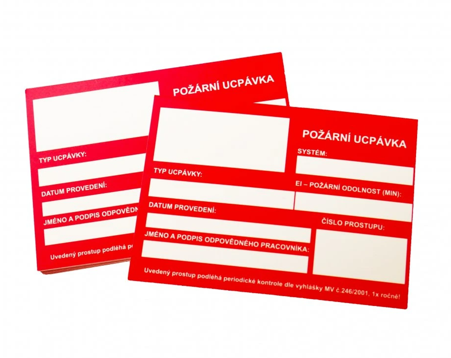 Univerzální štítek k protipožární ucpávkám. Lze nalepit k ucpávce jakýmkoliv akrylovým či silikonovým tmelem. Na objednání lze také zajistit štítky s hlavičkou Vaší společnosti (doba dodání se prodlouží cca o týden).