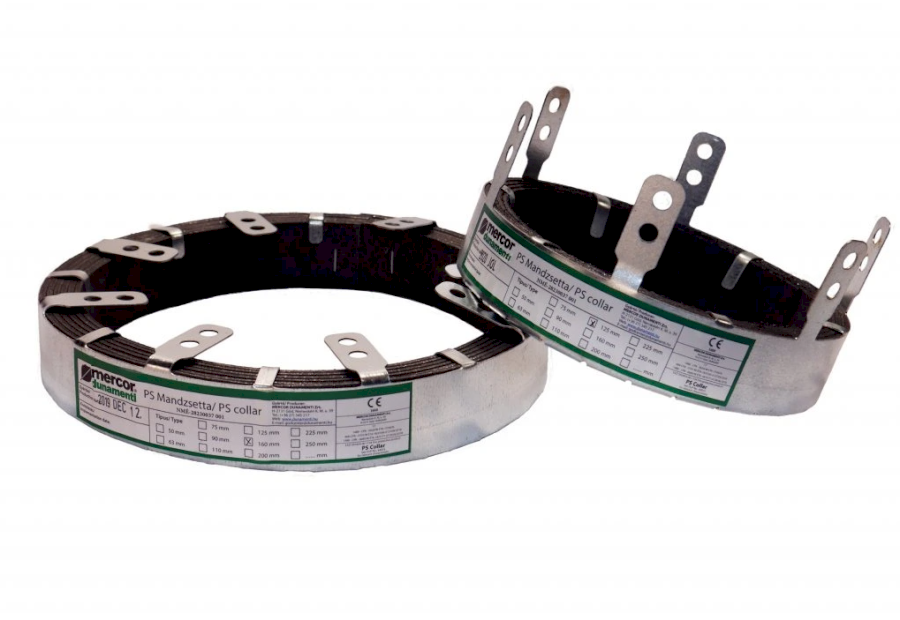 Protipožární manžeta s objímkou z ocelového plechu, vyplněná protipožárním laminátem.