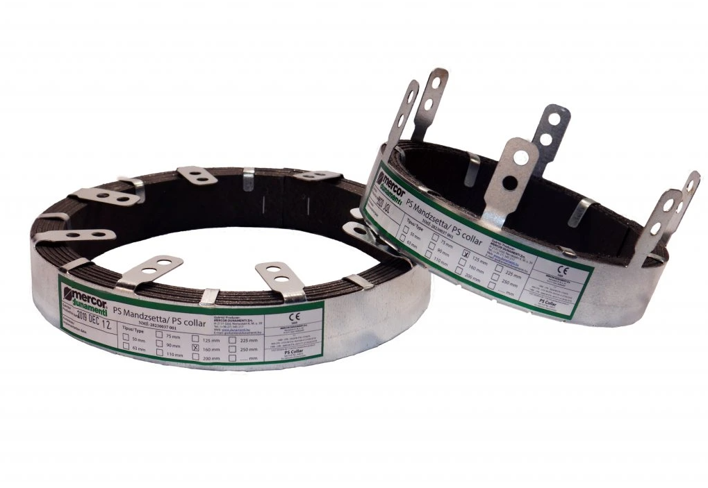 Protipožární manžeta s objímkou z ocelového plechu, vyplněná protipožárním laminátem.