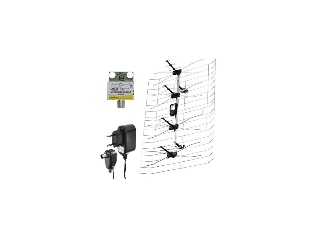 perfektní příjem digitálního televizního vysílání (DVB-T, DVB-T2) i rádia (DAB) sada složená z antény, předzesilovače a napájecího zdroje horizontální polarizace 30°, vertikální polarizace 40° LTE filtr (odstraní ze signálu nežádoucí rušení signálem mobilního internetu) kompatibilní s Full HD vysíláním