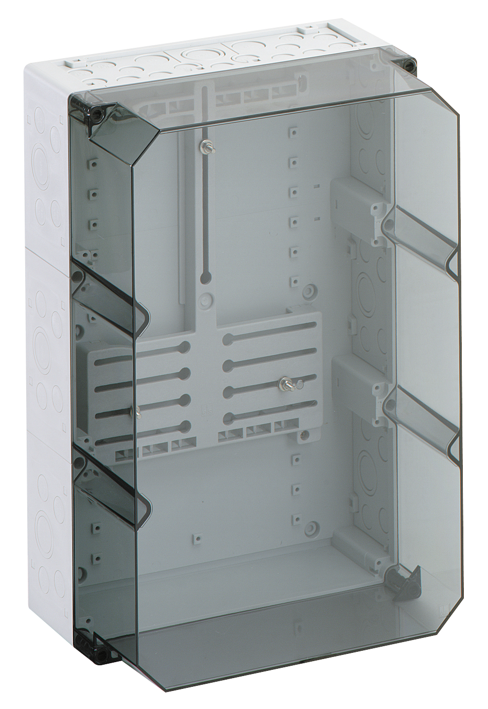 Skříň elektroměru, montážní plocha přístroje pole elektroměru podle DIN 43870-1, s průhledným víkem, sériově plombovatelným, s namontovaným křížem elektroměru pro třífázový elektroměr a upevňovacími šrouby elektroměru, s dvojitou membránovou vývodkou, uzavírací a izolační zátkou,