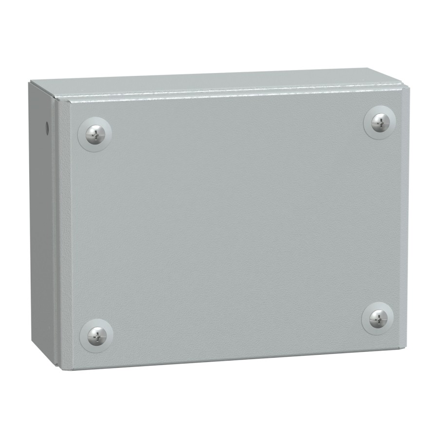 Industrial box for Spacial SBM. Multi purpose. 150 x 200 x 80 mm. Flat face box. Wall mounted on enclosure. Single piece body folded and welded. Cover fixing with half turn metal srew. Cover by 4 captive screw PZ2 outside sealed area. Made sheet of steel with polyester powder finish. Protection IP 66, IK10.