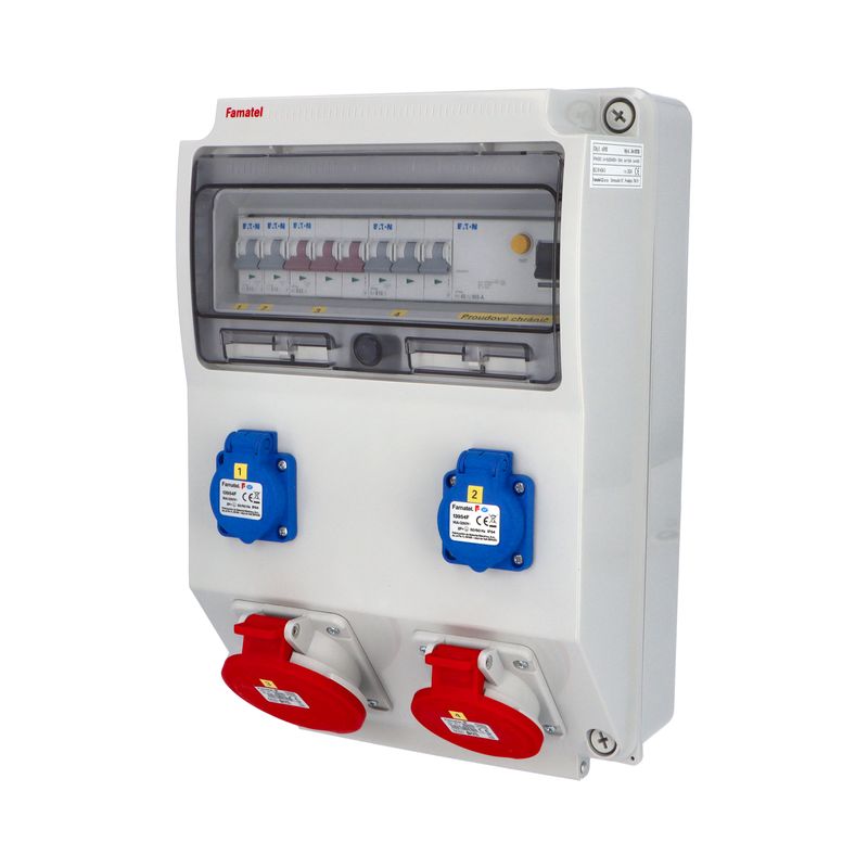 Zásuvková skříň (rozváděč nízkého napětí) FAMATEL v310-ZSF20101000.1 /3959 IP54 jištěná s chráničem 40/4/003-A, zásuvky 2x230V/16A (s ochranným kolíkem dle ČSN), 1x400V/16A/5pól, 1x400V/32A/5pól , jistící přístroje EATON 10kA: 2xPL7-B16/1, 1xPL7-B16/3, 1xPL7-B32/3, PF7-40/4/003-A na vstupu (citlivost na reziduální proud 30mA), použité pouzdro: 3959 - celkem k dispozici 12mod. míst, rozměry: 398x266x153mm, plastová, materiál ABS, IK08, zkouška žhavou smyčkou 650°C, bezhalogenová a UV odolná, montáž na povrch, barva: světle šedá, rozsah teplot -25°C +85°C, aplikované normy: IEC 61439-3 (Rozváděče nízkého napětí - Část 3: Rozvodnice určené k provozování laiky (DBO), balení: 1ks (fólie), zásuvky na 230V/16A s ochranným kolíkem dle ČSN, polykarbonátové okénko, jistící prvky EATON, PE svorkovnice součástí (6x16mm2), N svorkovnice součástí (6x16mm2), stěny s předlisovanými vstupy pro vyvrtání vstupního otvoru a následné osazení příslušnou vývodkou (pro CYKY 5x6; 4x10; 5x10 => M25; pro CYKY 5x16 => M32), max. připojitelný vstupní kabel = 4x25 nebo 5x16 (Cu), dodáno s průvodní dokumentací: štítkem rozváděče, návodem pro obsluhu a montáž, krycím listem (charakteristiky rozhraní), protokolem o kusové zkoušce, ES prohlášením o shodě, schématem zapojení a zkouškou oteplení pro rozváděče nízkého napětí. Recyklační poplatek je zahrnut v ceně výrobku.