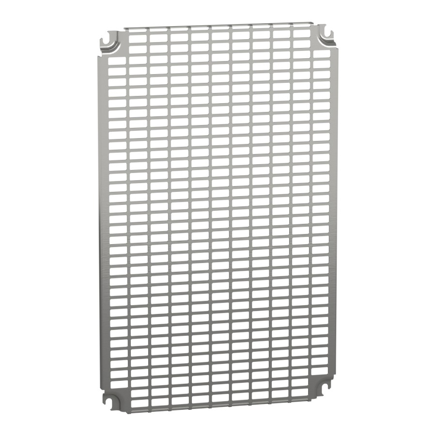 Monobloc perforated plates with universal perforations for CRN, S3D, PLM. For enclosures H is600 x W is400 mm. Multi-purpose accessory. Step slide or direct fixing on back studs mounting (M8 screws). Telequick perforated. Cut-out dimensions is 11x26mm. Steel made, zinc coated surface finish. 418 slots. Variant particularity is Installation in rear of enclosure.