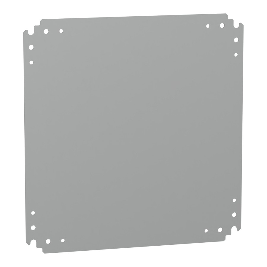 Thalassa PLA/PHD metallic mounting plate. For enclosure H is500 x W is500 mm. Step slides mounting location or on back inserts location (fixing by screw type M8). Plain mounting plate. 150 Kg permanent permissible load. Galvanised Steel. Grey RAL 7035.