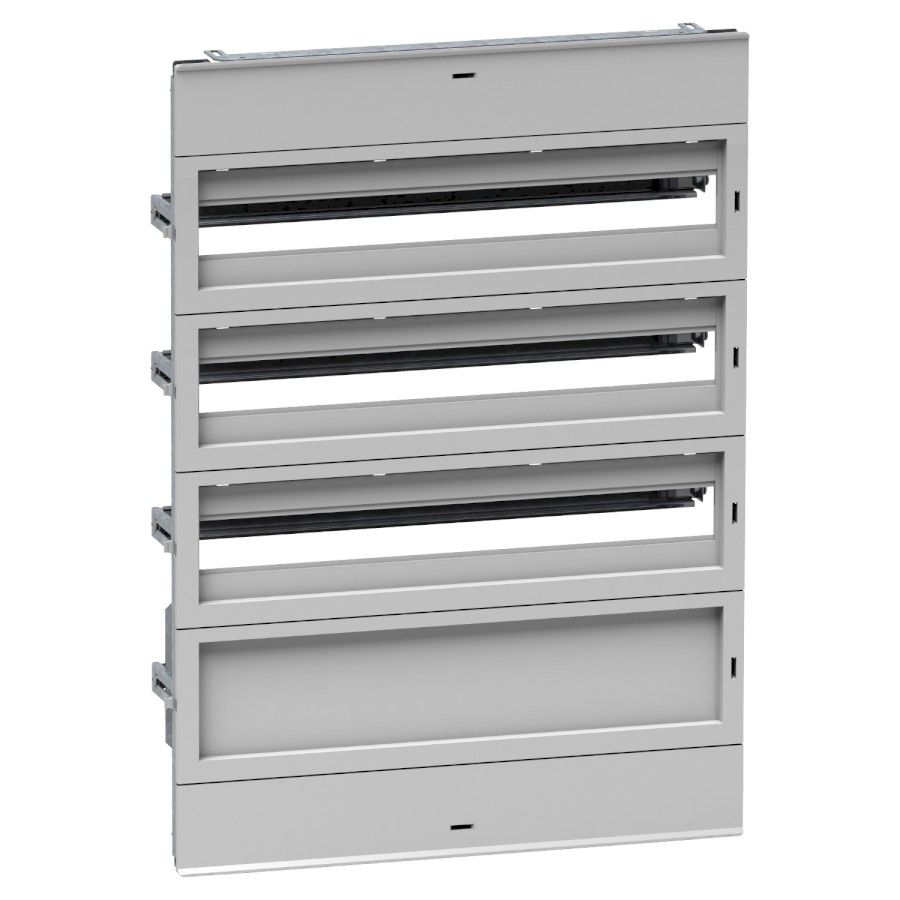 Modulární distrib. rám 84modulů pro NSYPLM86,NSYS3D86,NSYCRN86,NSYS3X86. řada: Spacial - příslušenství / náhradní díly: montážní příslušenství - použití zařízení: modulární distribuční aplikace, víceúčelové - typ produktu nebo součásti: rám - označení přístroje: DLA - montážní poloha: přední část skříně - kompatibilní řada: Spacial CRN, Spacial S3X, Spacial S3D, Thalassa PLM - sestava zařízení: 1 plný čelní panel s montážní deskou, 1 složení šasi (kostry), 2 povrch krytu, 1 nulový/zemnící pásek 2 x 16 mm2 5 x 6 mm2, 3 čelní panely s 35 mm lištou DIN - počet kusů na sadu: sada 1.
