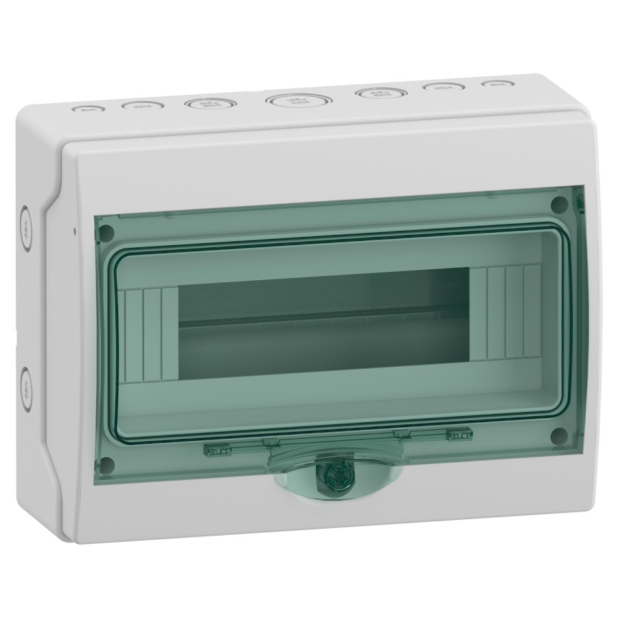 Kaedra skříň odolná proti povětrnostním vlivům je rozvodnice pro modulární přístroje pro povrchovou montáž. Je složena z 1 řady 12 modulů 18mm. Lze použít všechny typy modulárních spínacích zařízení. Tato skříň je určena pro vnitřní i venkovní voděodolné instalace. Stupeň ochrany je IP65. Jsou vybaveny průhlednými zelenými dveřmi. Barva boxu je světle šedá (RAL 7035). Je určen k instalaci do obytných, malých a průmyslových budov. Kabely mohou vstupovat do horní nebo spodní části skříně skrz 7 předprolisů. Je vybaven zadní deskou a předním krytem se zářezem. Je vybaven lištou DIN. 2 svorkovnice lze instalovat na zadní stranu skříně. Každá má 8 vývodů (4x10mm² + 4x16mm²). V rámci produktu se dodává také označovací sada. Třída elektrické izolace je třída II (dvojitá izolace). Kategorie přepětí je třída II. Rozptýlený výkon je 19 W. Jmenovitý proud je až 63 A. Tento produkt vyhovuje normě IEC 61439-3. Rozměry jsou (Š) 267 mm x (V) 200 mm x (H) 112 mm. Materiál je samozhášecí polymerový materiál. Jeho odolnost vůči plamenům a abnormálnímu teplu je 650 °C podle IEC 60695-2-1. Je odolný proti ultrafialovému záření. Stupeň ochrany je IK09. Provozní teplota je -25 °C až 60 °C.