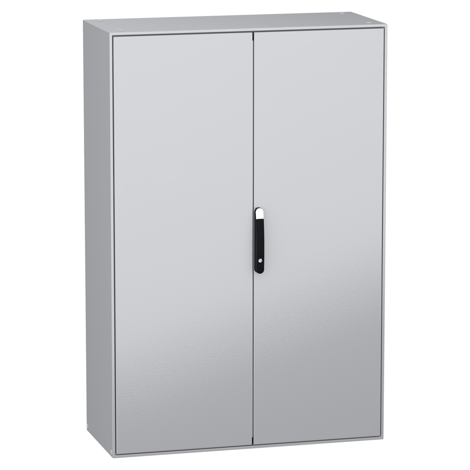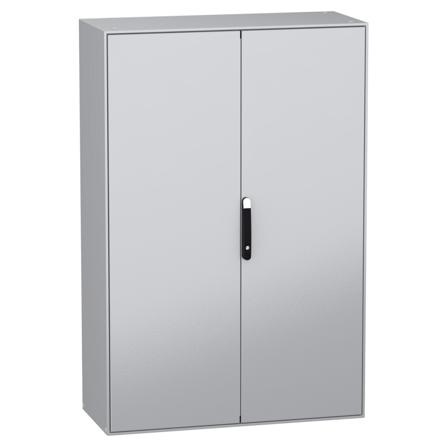 Spacial SM monobloc compact steel enclosure with 2 plain front doors. 1800 x 1200 x 500 mm. Back panel welded, mounting plate included. 4 point door locking system with handle DB 5mm. Sheet steel, galvanized steel for mounting plate. Protection IP 55, IK10, Grey RAL 7035. 4 mounting plate support brackets included.