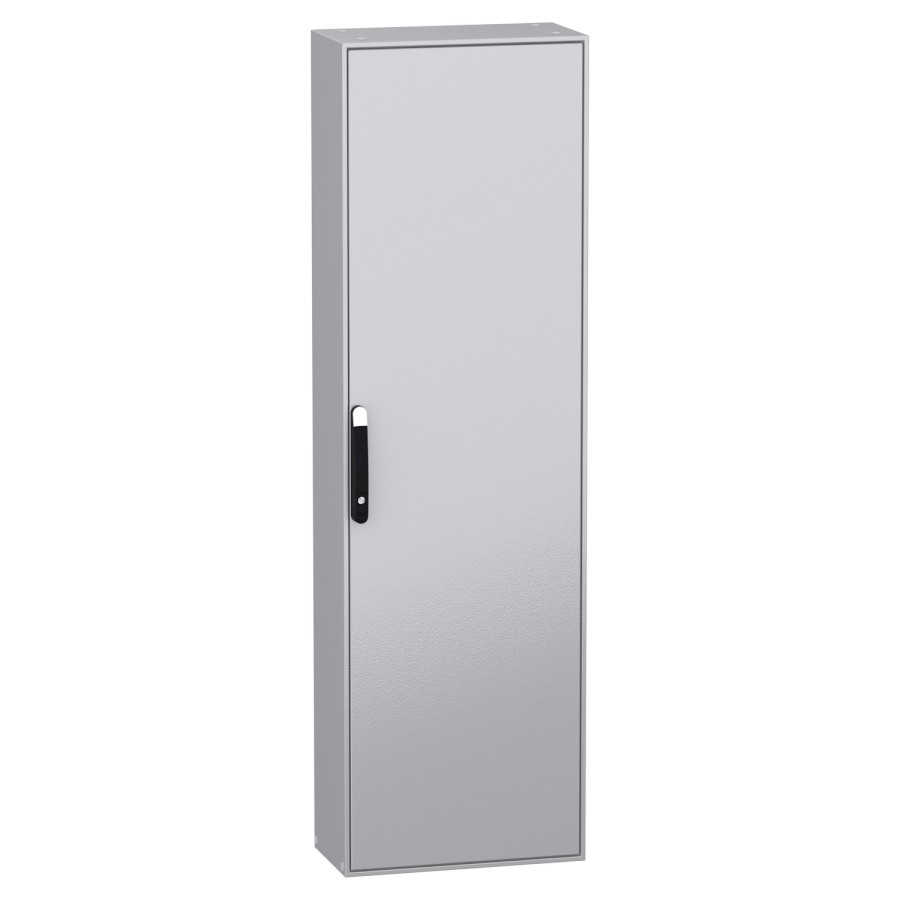Spacial SM monobloc compact steel enclosure with plain front door. 2000 x 600 x 300 mm. Back panel welded, mounting plate included. 4 point door locking system with handle DB 5mm. Sheet steel, galvanized steel for mounting plate. Protection IP 55, IK10, Grey RAL 7035. 4 mounting plate support brackets included.