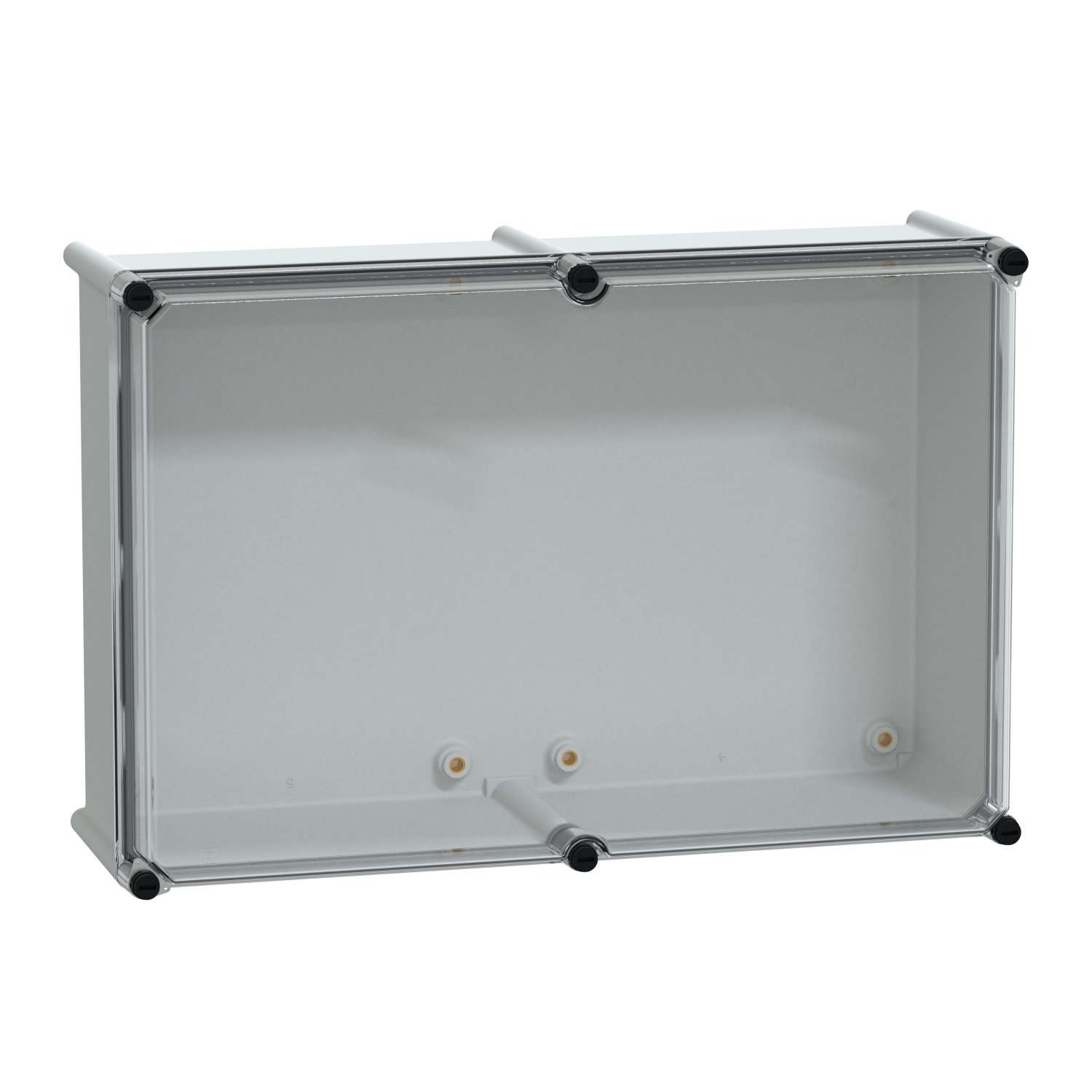 Thalassa PLS box polyester rear with transparent PC cover. 360 x 540 x 180 mm. Insulating modular box. One piece moulded body. Wall mounted. High transparent cover, cover locking screw removable. Polyester reinforced with fibreglass rear, polycarbonate cover. Grey RAL 7035. IP65, IK09, NEMA (13,4X) 960°C fire resistance. Insulation Class II.