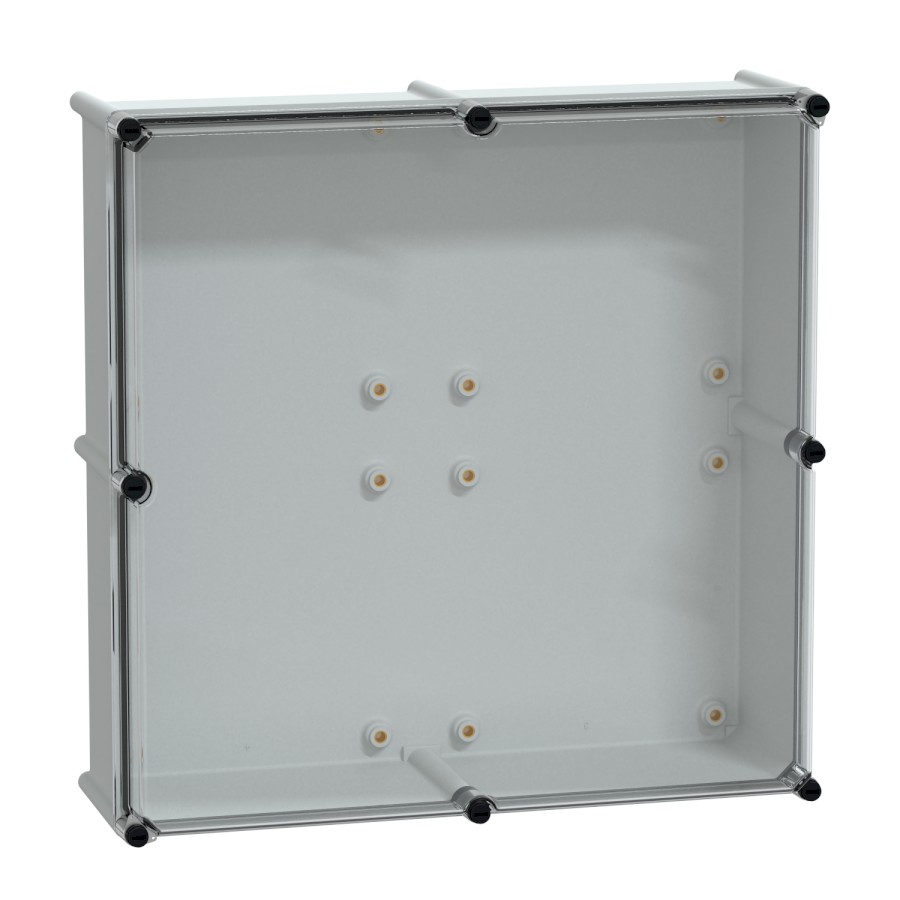 Thalassa PLS box polyester rear with transparent PC cover. 540 x 540 x 230 mm. Insulating modular box. One piece moulded body. Wall mounted. High transparent cover, cover locking screw removable. Polyester reinforced with fibreglass rear, polycarbonate cover. Grey RAL 7035. IP65, IK09, NEMA (13,4X) 960°C fire resistance. Insulation Class II.