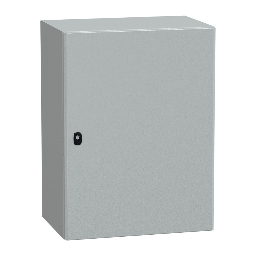 Spacial S3D wall mounted steel enclosure with plain door. 800 x 600 x 400 mm. Single piece body, without mounting plate. Robust construction based on a new design. 3-point closure system with handle and 3 mm double bar lock insert. Steel made, epoxy-polyester powder finish. Gutter shaped front rail double sheet thickness. Protection IP 66, IK10, Grey RAL 7035. 1 cable gland plate included, standard. Extensive range of accessories. Packaging is reusable after assembly.