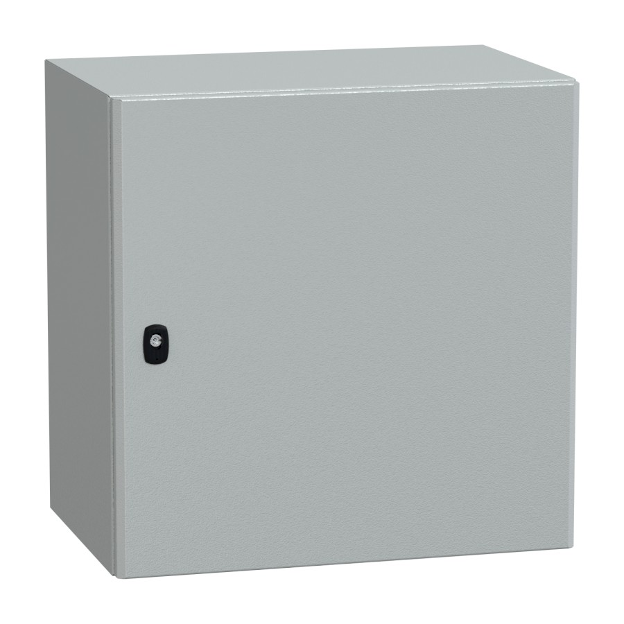 Spacial S3D wall mounted steel enclosure with plain door. 599 x 600 x 250 mm. Single piece body, mounting plate included. 3-point closure system with handle and 3 mm double bar lock insert. Steel made, epoxy-polyester powder finish. Protection IP 66, IK10, Grey RAL 7035.