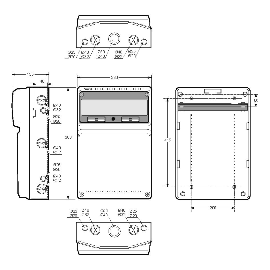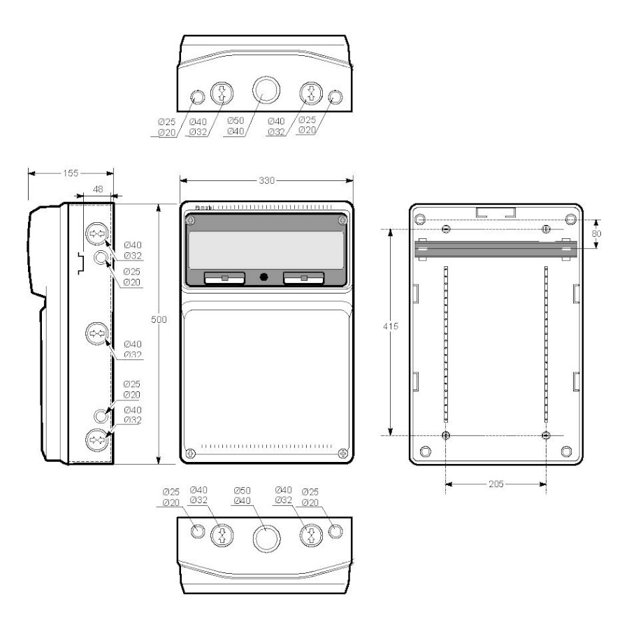 Plastová skříň AcquaCOMBI 3952 s prostorem pro umístění zásuvek a ovládacích přístrojů, ve vyšším krytí IP65, rozměry: 500x330x155mm, (výška x šířka x hloubka), speciálně zesílená stěna víka (5mm), modulový prostor 16mod., IK08, materiál ABS plast, zkouška žhavou smyčkou 650°C, bezhalogenová a UV odolná, montáž na povrch, barva: světle šedá, rozsah teplot -25°C +85°C, aplikované normy: EN 62208, balení: 1ks (fólie), polykarbonátová průhledná dvířka, 2ks PE svorkovnice součástí (2x16 mm2 + 4x10 mm2) / 2ks N svorkovnice součástí (2x16 mm2 + 4x10 mm2), stěny s předlisovanými vstupy pro vyvrtání vstupního otvoru a následného osazení příslušnou vývodkou, schopnost rozptylu tepla: 41W, dokoupitelné příslušenství: kovový zámek 3900, průchodka pro spojování skříní 3903, držadlo 3917. Pro montáž na hořlavé podklady je nutné použít nehořlavou podložku.