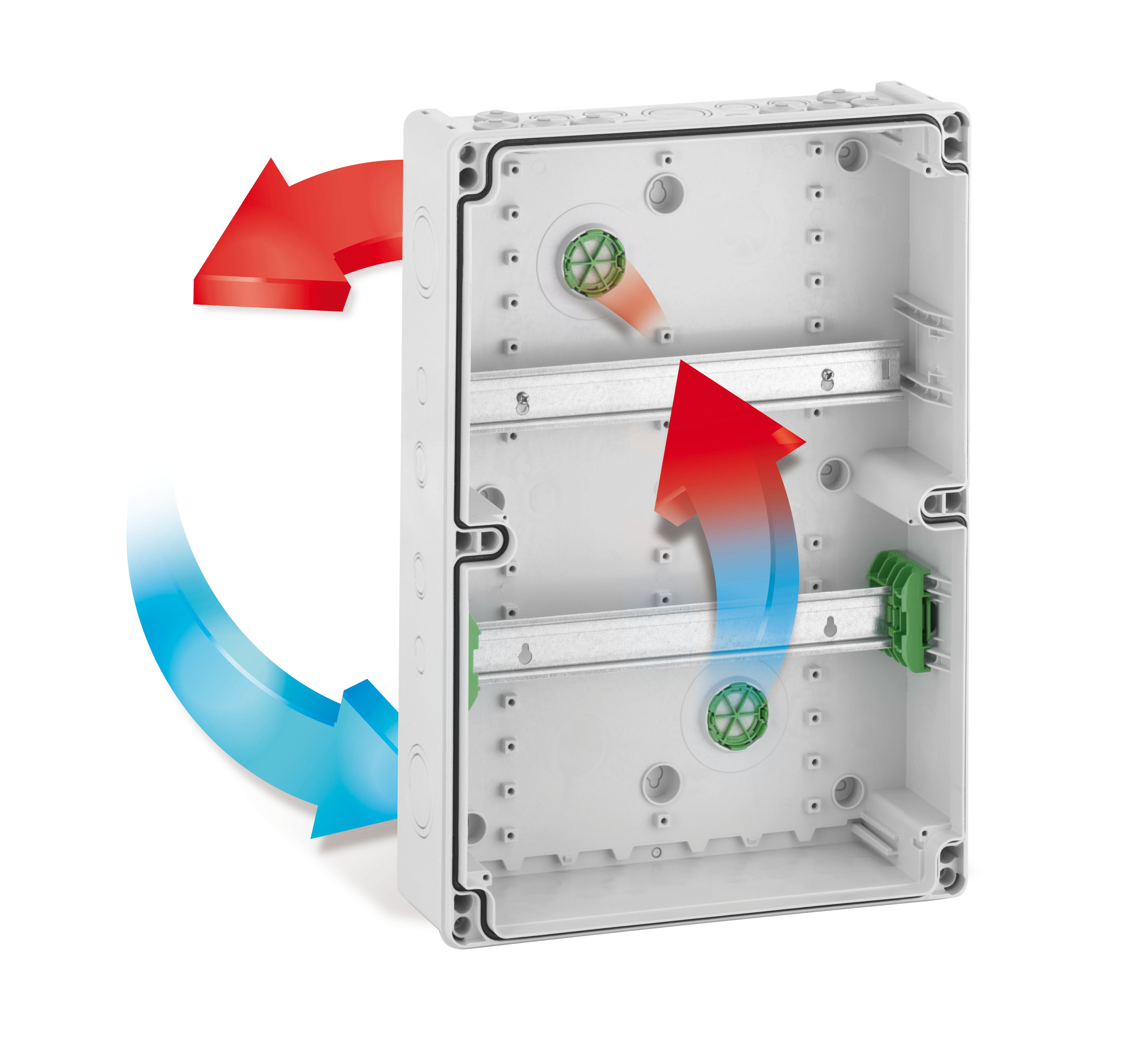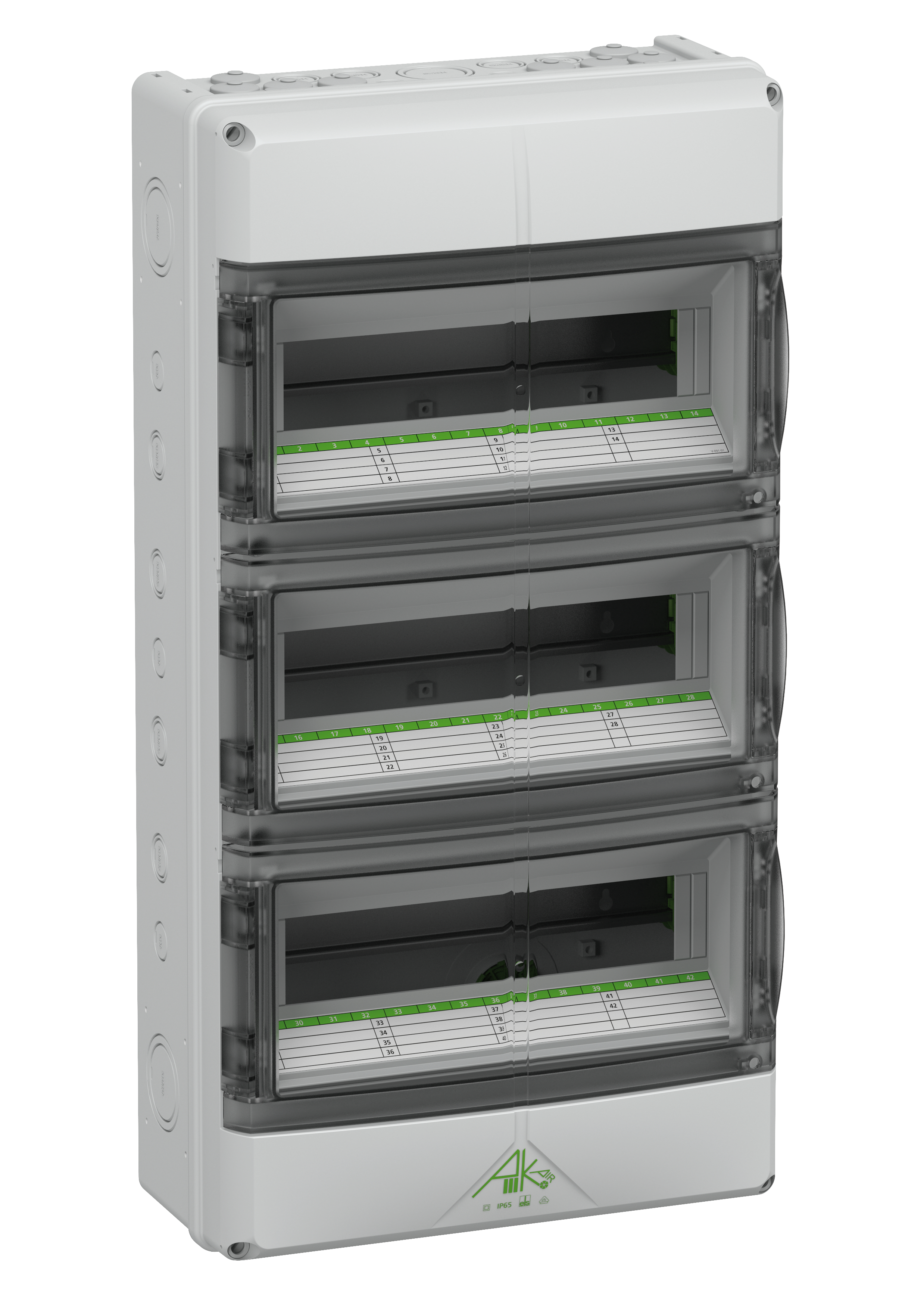 Malý rozvaděč, druh krytí IP65, 42 Mod., rázová houževnatost IK08, třída ochrany II, Jmenovité napětí 400V AC, DLG, UL-EU, VDE, bez obsahu halogenů