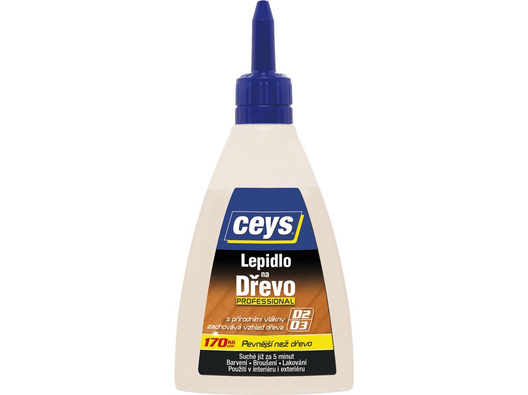 Ceys lepidlo na dřevo Professional D2D3 je speciální lepidlo pro lepení všech druhů dřeva, aglomerátů, laminátů, překližek a vrstvených materiálů mezi sebou nebo v kombinaci s jinými materiály. Ceys lepidlo na dřevo Professional D2D3 je ideální pro montování nebo sklížení plovoucí podlahy. Obsahuje přírodní vlákna (PATENTOVANÁ FORMULE), která poskytují povrchu vzhled dřevěného provedení a maximální odolnost – až 170 kg/cm2 . Ceys lepidlo na dřevo Professional D2 D3 se klasifikuje jako D2, D3 dle normy UNE-EN 204.