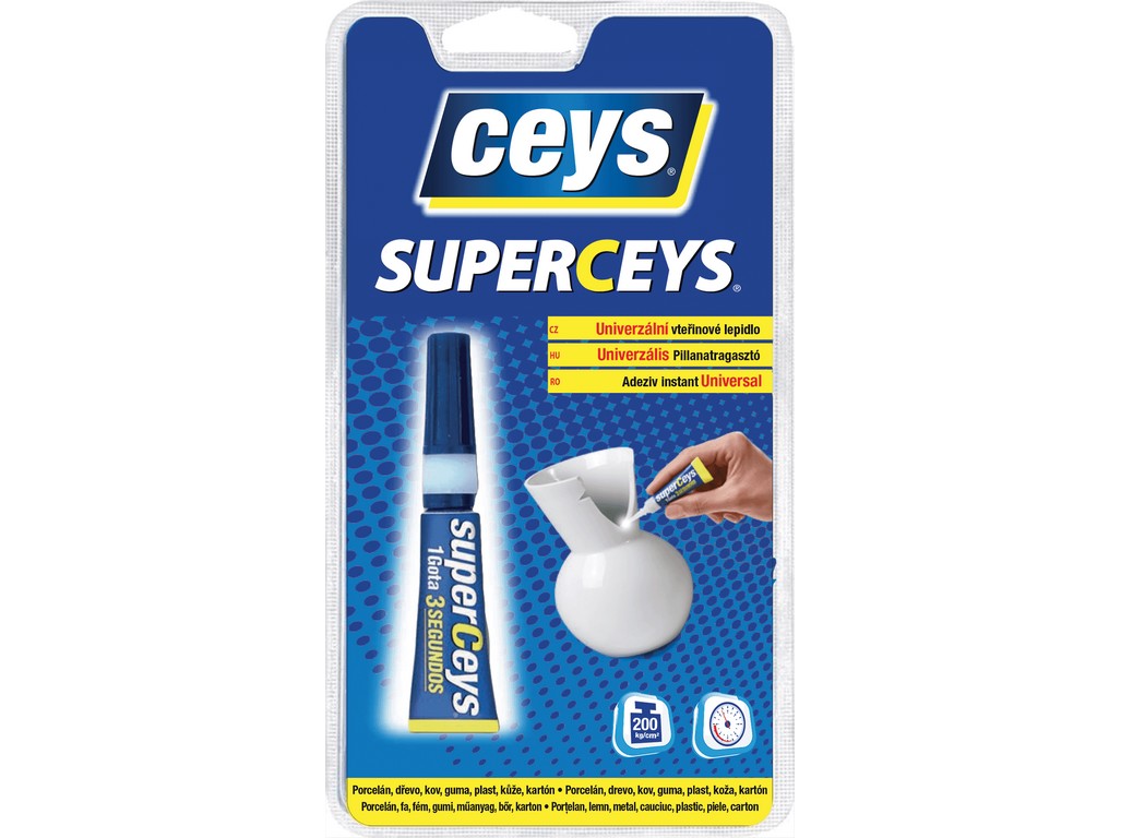 Superceys je vysoce odolné a snadno aplikovatelné transparentní vteřinové lepidlo, ideální pro rychlé práce. Víceúčelové lepidlo. Spojuje prakticky všechny materiály, a to v jakékoliv kombinaci. Není určeno pro polyethylen, polypropylen, Porex®, PTFE, syntetické tkaniny a pro aplikace ve vodě.