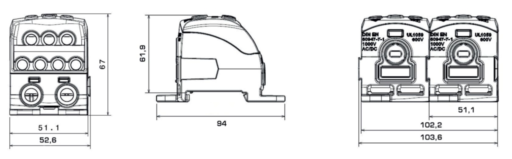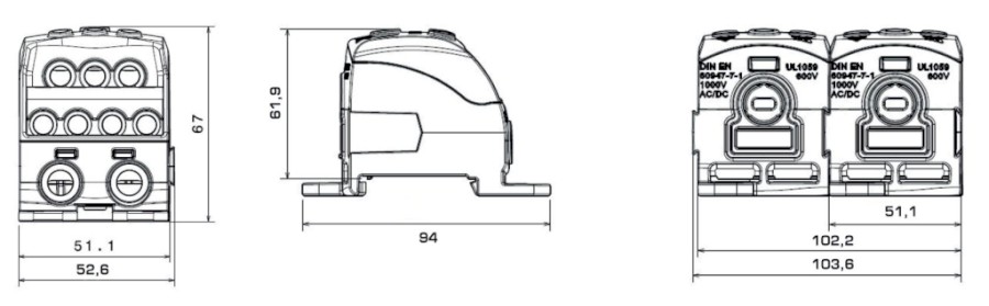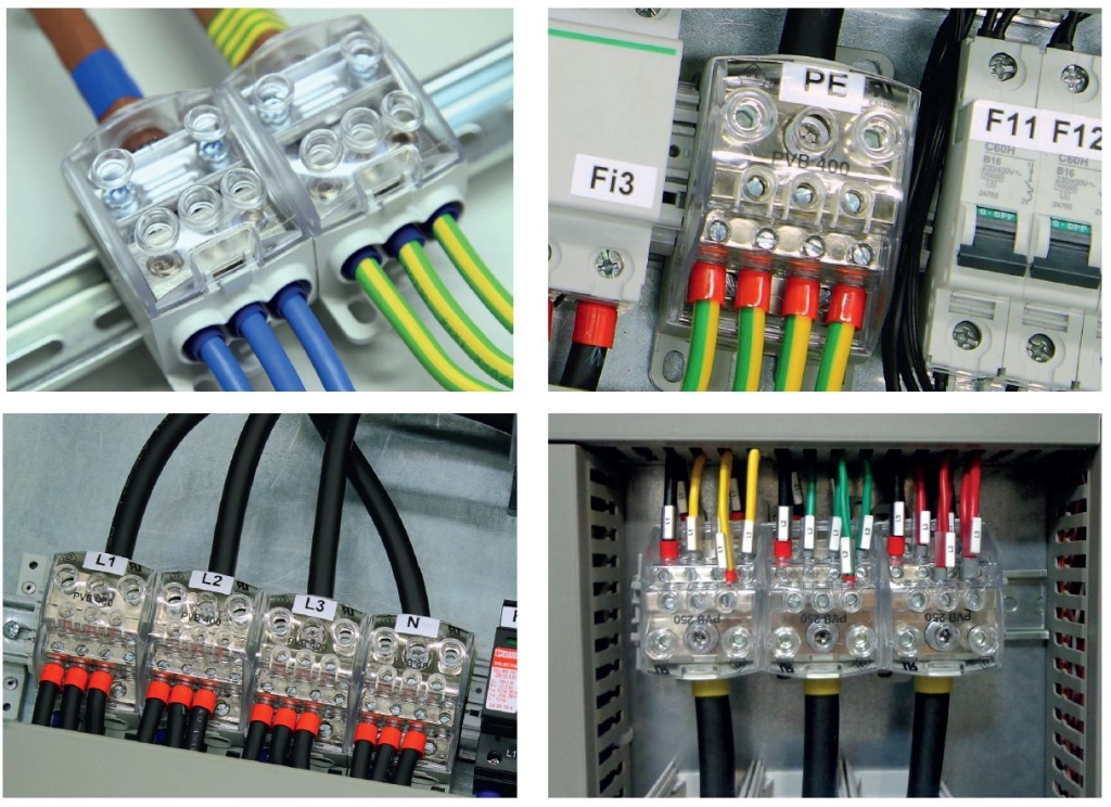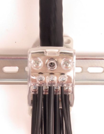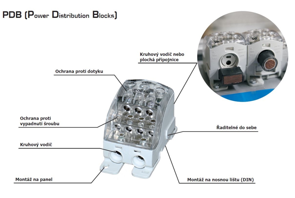 Blok pro rozdělení fází PDB 490 (PVB 400), 1pól., 490A, 690V, šedý/průhl. víko, na DIN