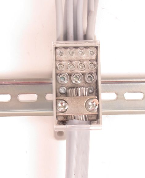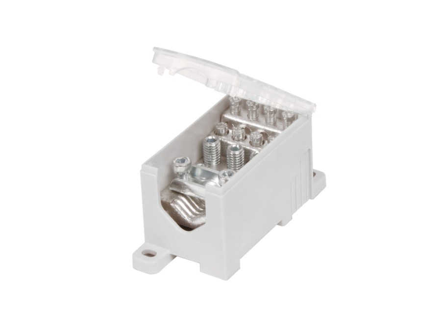 Blok pro rozdělení fází PVB 250-3/8, 1pólový, pro AL/CU vodiče, jmenovitý proud 250A, jmenovité napětí 690V, barva šedá, montáž na DIN lištu / PANEL, krytí IP20, vstup 1x120mm2, výstup 3x35mm2, 8x16mm2.