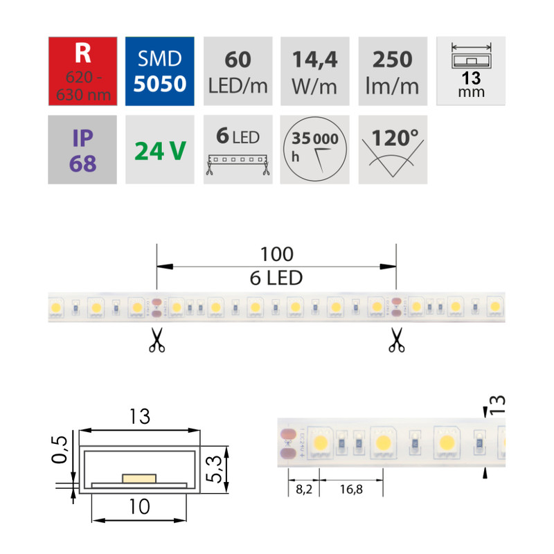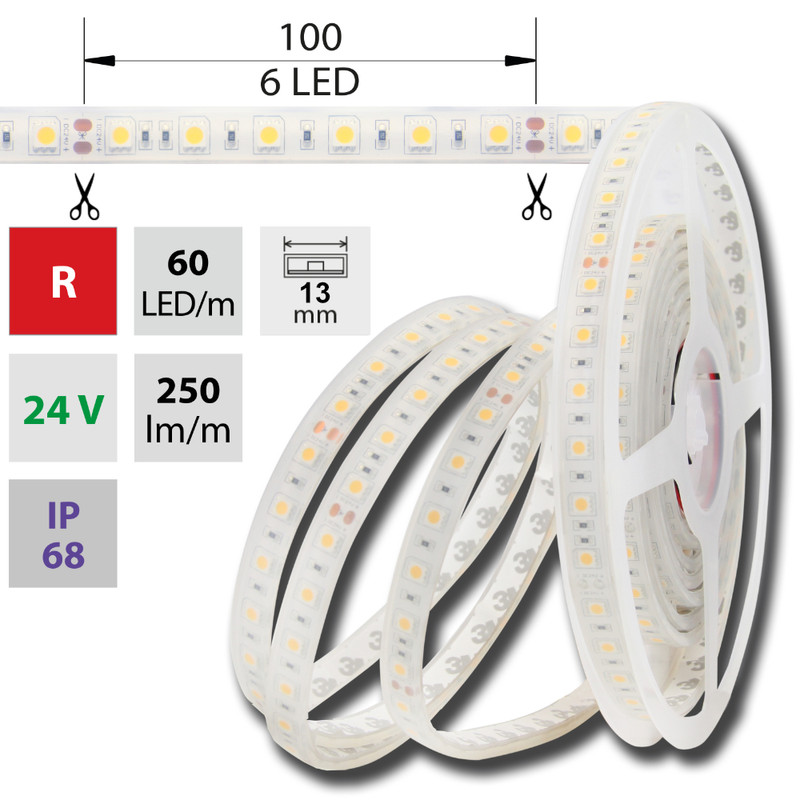 LED pásek SMD5050 R, 60LED/m, 14,4W/m, 250lm/m, IP68, DC 24V, 13mm, 5m