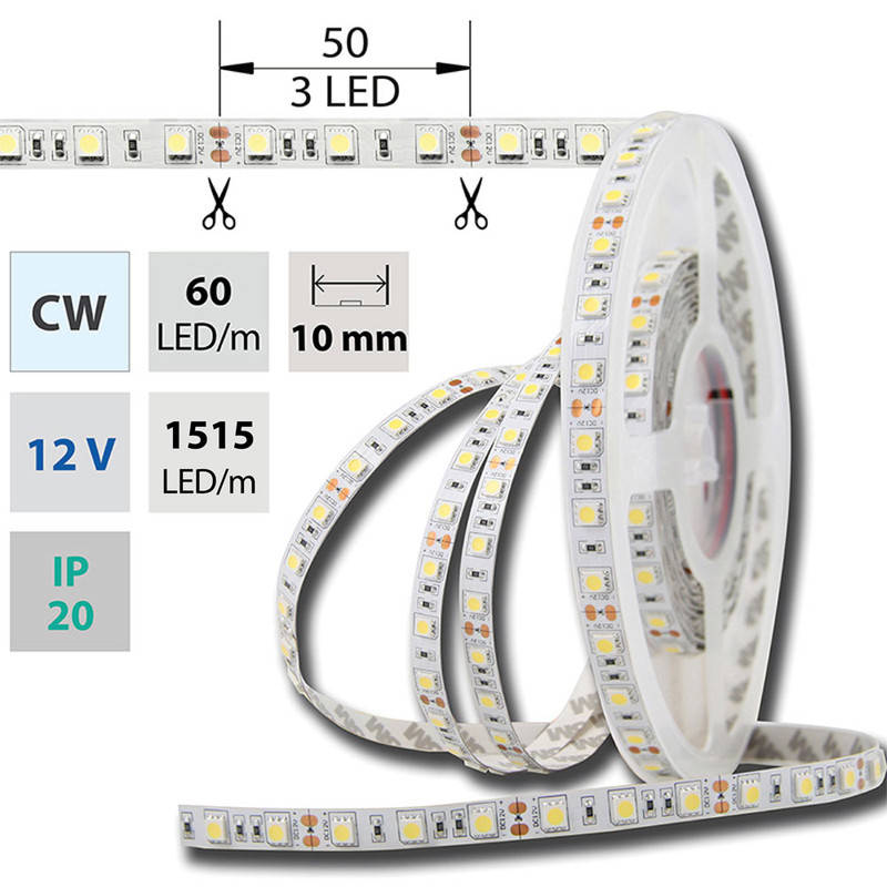 LED pásek SMD5050 CW, 60LED/m, 14,4W/m, DC 12V, 1515lm/m, IP20, 10mm, 5m