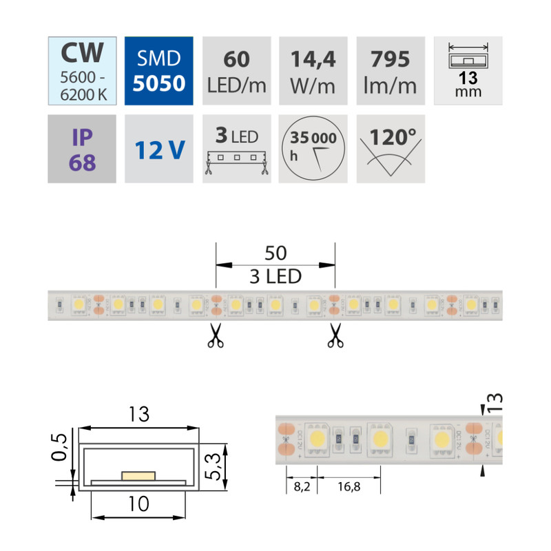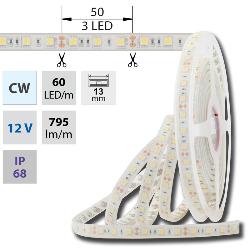 LED pásek SMD5050 CW, 60LED/m, 14,4W/m, 1180lm/m, IP68, DC 12V, 13mm, 5m