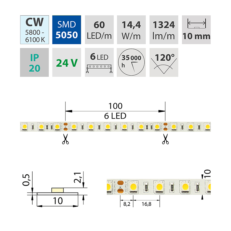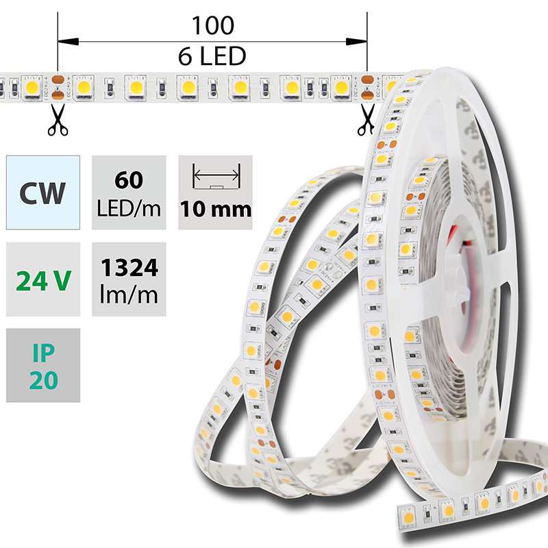 LED pásek SMD5050 CW, 60LED/m, 14,4W/m, DC 24V, 1515lm/m, IP20, 10mm, 5m