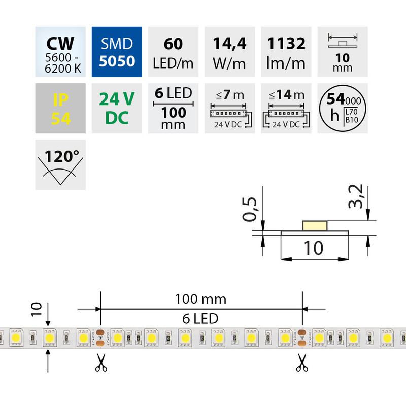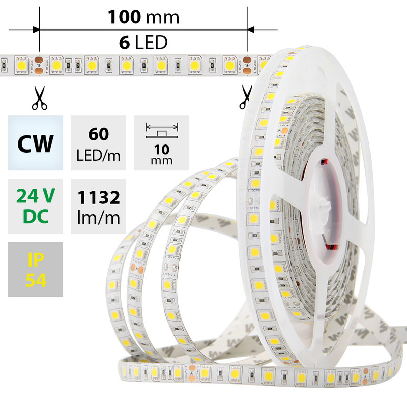 LED pásek SMD5050, studená bílá (6000K), 14,4W, 60LED, 1132lm/m, segment 100mm, 6LED/segment, IP54, DC 24V, životnost 54000h, šíře 10mm, bílý PCB pásek, max. délka pásku při jednostranném zapojení: 7m, opatřen samolepící páskou 3M.