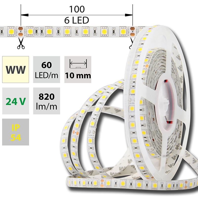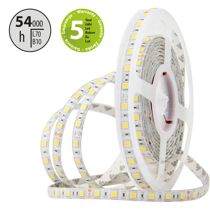 LED pásek SMD5050 teple bílý, 60LED/m, IP54, DC 24V, 10mm, 5m